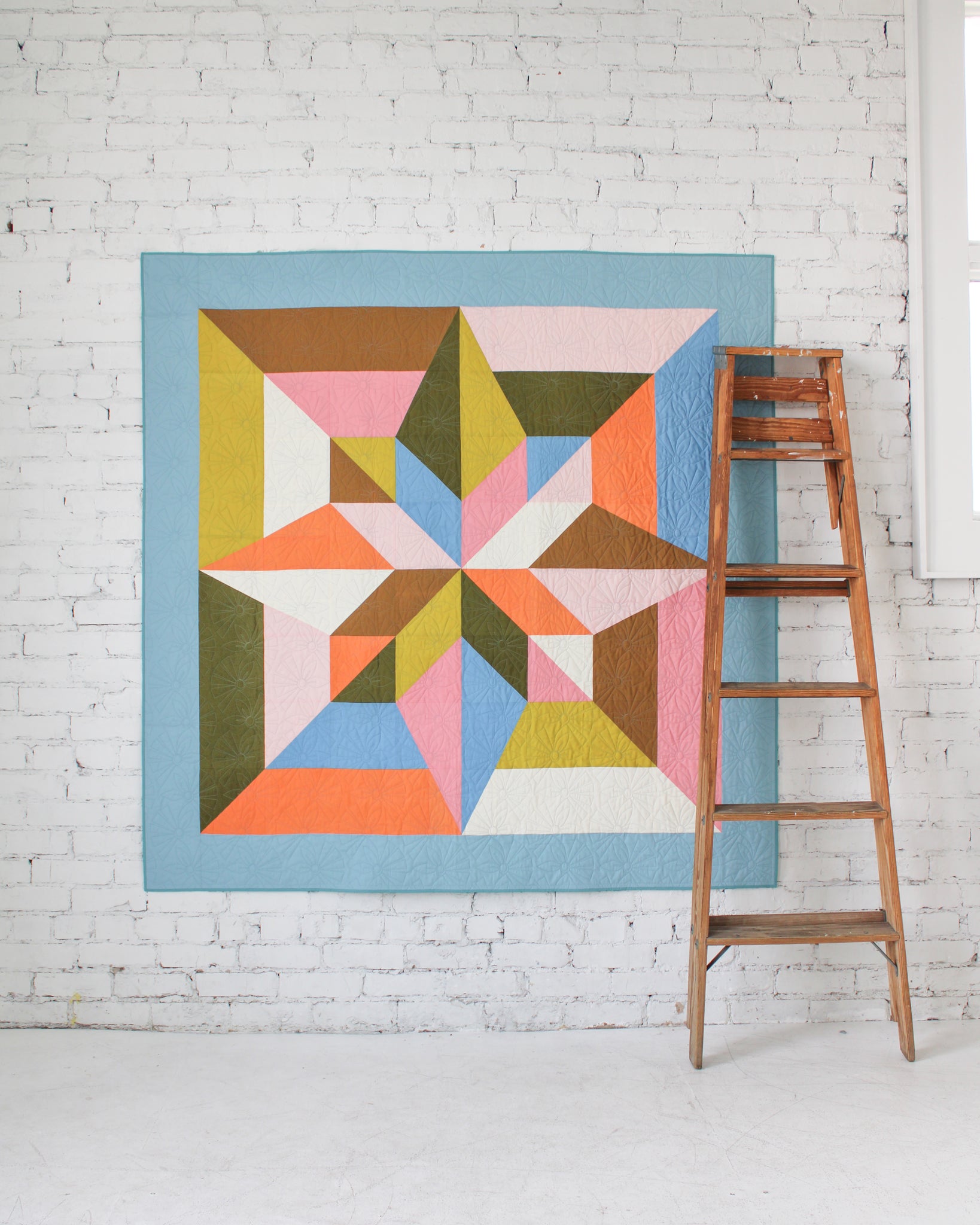 Colorful geometric quilt with star pattern on a white background. Arete Quilt bundle in Jewel by Eudaimonia Studio, available at globalfibershop.com.