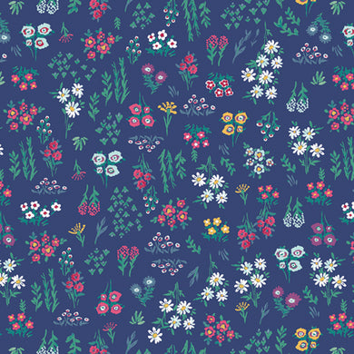 Pattern of blue and white strawberries on a navy background.