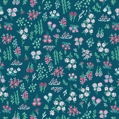 Pattern of pink and white strawberries on a turquoise background. Ruby Star Society available at globalfibershop.com.