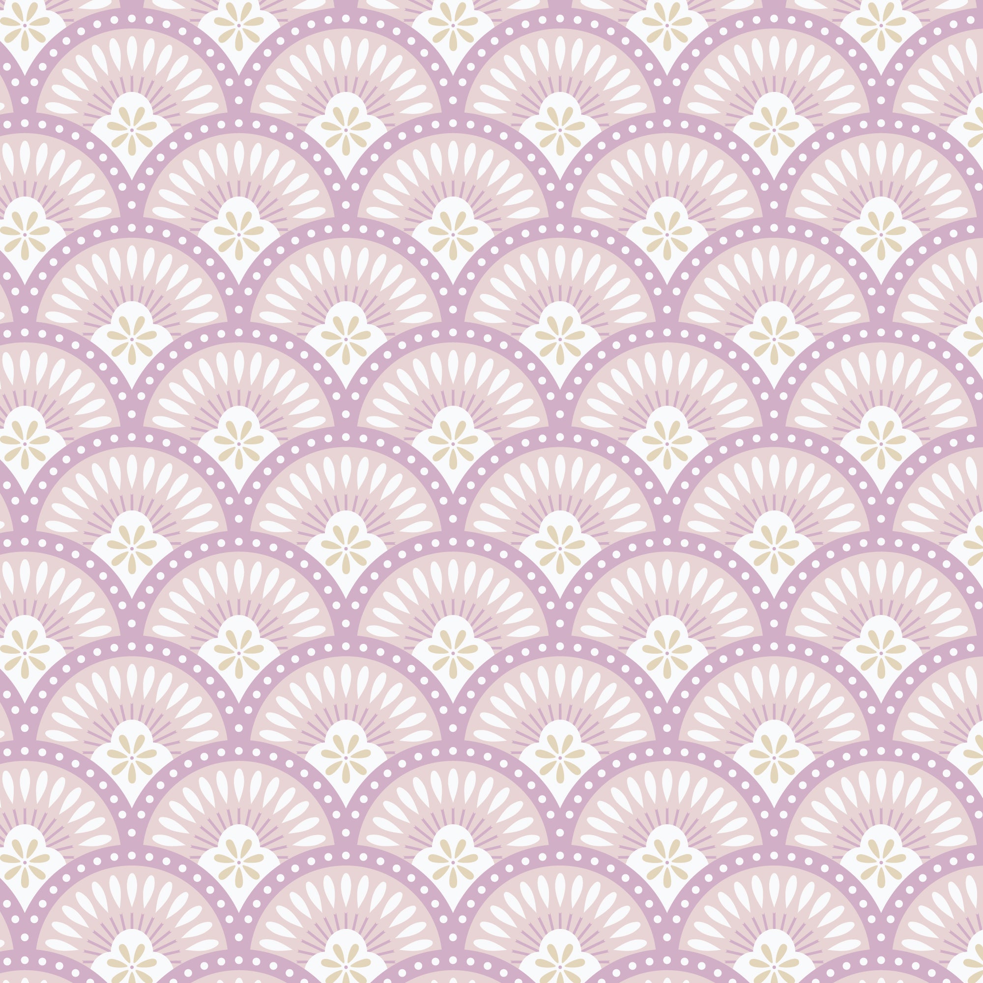Pattern of overlapping circular shapes with floral elements on a light purple background. Decorative pattern with teardrop shapes on a beige background. From the Bohemian Spirit Collection by Dots & Glory for Cloud9 Fabrics sold at globalfibershop.com.