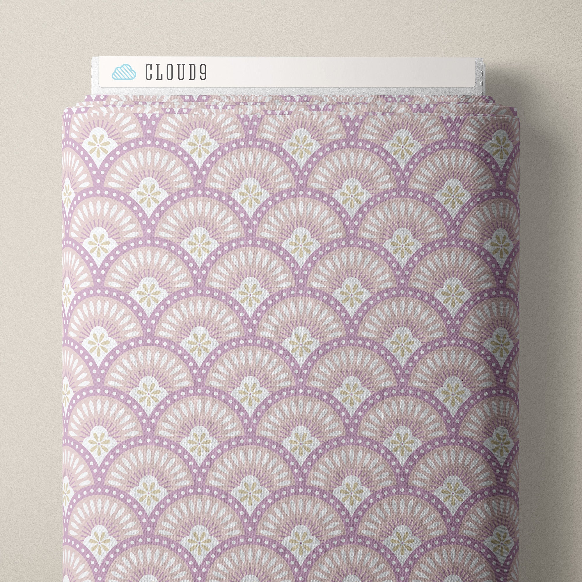 • Load image into Gallery viewer, Pattern of overlapping circular shapes with floral elements on a light purple background. Decorative pattern with teardrop shapes on a beige background. From the Bohemian Spirit Collection by Dots & Glory for Cloud9 Fabrics sold at globalfibershop.com.