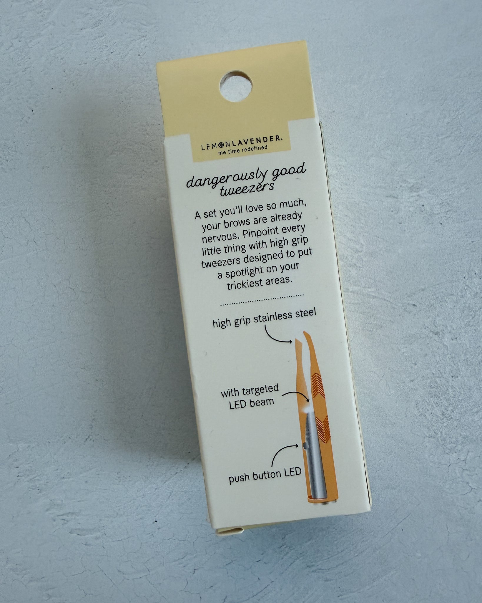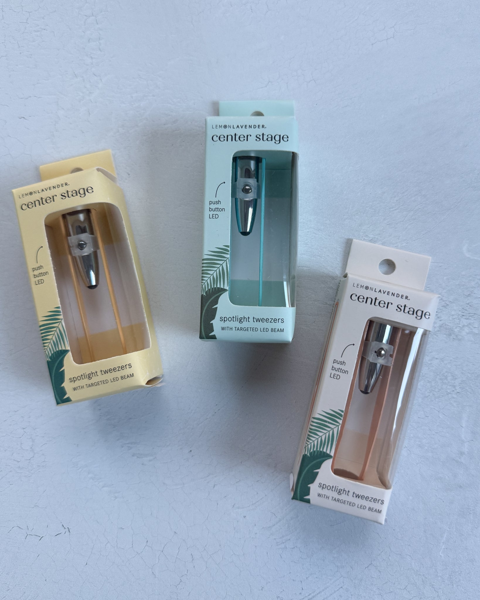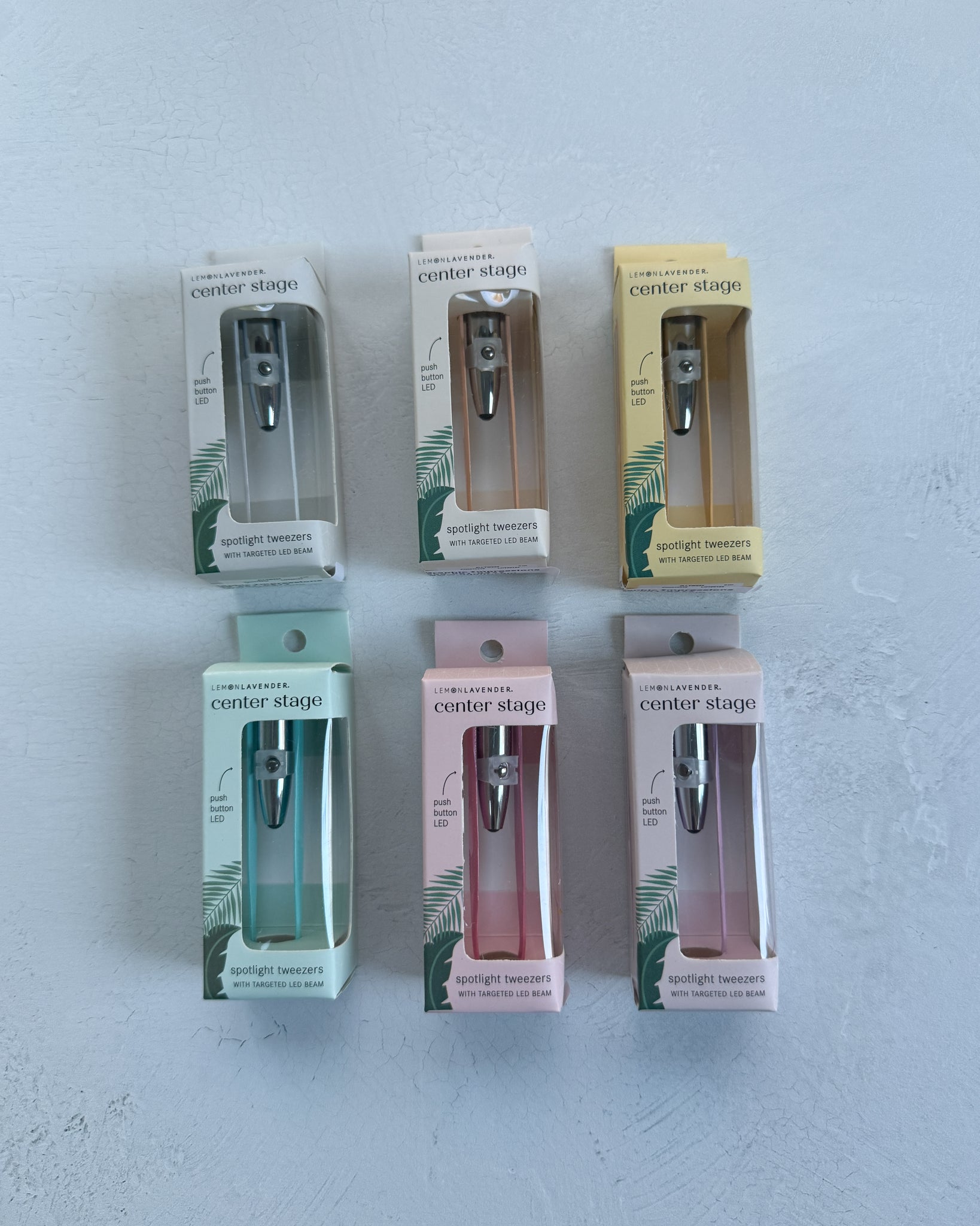 Angled tips offer an attentive grip. Shine light on targeted area. Stainless steel, touch button LED light. Protective case. Tweeze with ease. Assorted colors. 3.25" long.